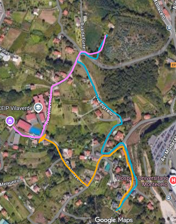 Hai dúas opcións, verificar por onde cruza o Petronila para descartar a aportación ó Valdecorvos, ou baixar ó CEIP Vilaverde para investigar dende o río. Decidimos facer as dúas cousas e comezamos co Petronila, seguindo o camiño que conecta a Rúa Vilaverde e a Rúa dos Pradiños, pola chamada Rúa Fonte. Semella que o rego descorre ata a Rúa dos Pradiños bifurcado en dúas partes, unha ven pola canle de pluviais da Rúa dos pradiños e outra pola parte máis ó leste do muro de pedra da parcela do pazo, pasando ó carón ou por debaixo. Despóis se soterra e entuba, chegando á av. de Lugo.